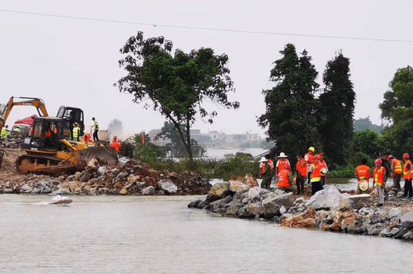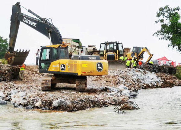 整個封堵工作共動用水建公司400余名施工人員;調(diào)配挖機12臺、裝載機5臺、推土機2臺、運輸車216臺;調(diào)配塊石約3萬立方米、卵石約2500立方米、粘土約9000立方米、1立方米鋼筋籠260多個、3噸重混凝土塊160多塊。