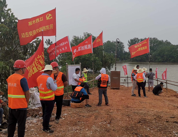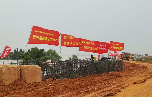 7月12日晚,九江市永修縣三角聯(lián)圩發(fā)生潰堤,決口長度100多米,洪水淹沒了圩堤內(nèi)紅旗村、永豐墾殖場等部分地區(qū)。公司在接到省防指和水利廳下達的防汛任務后,積極響應,緊急抽調(diào)并組建了一支90余人的專業(yè)隊伍,并迅速落實機械設備。由公司黨委書記、董事長王元旦親自帶隊,星夜馳援一線。